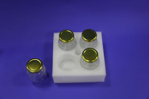 为破局,该品牌引入小型容器专用 EPE 珍珠棉内衬方案:厂家根据其小样瓶的尺寸,定制四孔阵列式圆孔结构,每个圆孔与瓶身严丝合缝,实现 “单瓶独立固定”;EPE 珍珠棉的闭孔气泡结构,能高效吸收运输中的震动与冲击力,从根源上避免瓶身碰撞;同时,轻量化的材质让包装整体重量比传统泡沫方案降低 20%,物流成本同步缩减。