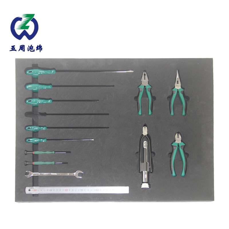 雕刻EVA泡绵产品是环保级别无毒味,外型有层次感,耐冲击能力强,密闭性好,耐腐蚀,耐酸碱,能合理的保护各种易损件或制成品。EVA泡绵一般常规为黑色,表面细微微小细孔结构具有防潮、抗震效果等特性。因此在许多制造行业使用广,尤其是五金工具类和化妆品类。雕刻EVA泡绵可根据客户需求硬度选择从15-80不一样硬度,另外还可根据需求在EVA泡绵植绒布等生产加工,让商品看起来大气上档次。