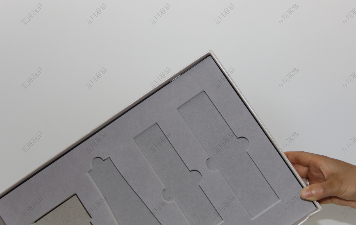 内衬的槽位完全适配套装内的瓶罐与配件 —— 五周泡棉通过激光切割工艺加工出贴合产品轮廓的槽位,误差控制在 ±0.1mm 内,瓶罐嵌入后无缝贴合,避免运输中晃动导致的玻璃破损;浅灰色材质与礼盒的简约调性呼应,提升了包装的高端质感,同时中密度 EVA(密度 50kg/m³)的缓冲性能可吸收快递冲击,保护护肤品瓶罐不受损。